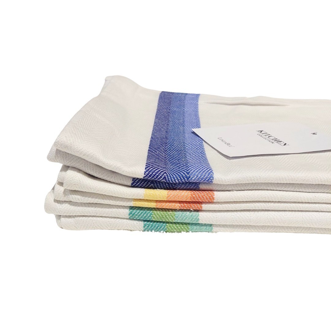 Lo strofinaccio 100% cotone bianco con fasce colorate laterali è un prodotto eccezionale, noto per la sua resistenza, sofficità e capacità di essere lavato ad alte temperature. Ideale per l'uso in cucine professionali e domestiche, offre un'asciugatura efficiente senza pelucchi o aloni. Con dimensioni generose e una densità di tessuto ideale, è una scelta affidabile per ambienti igienici.