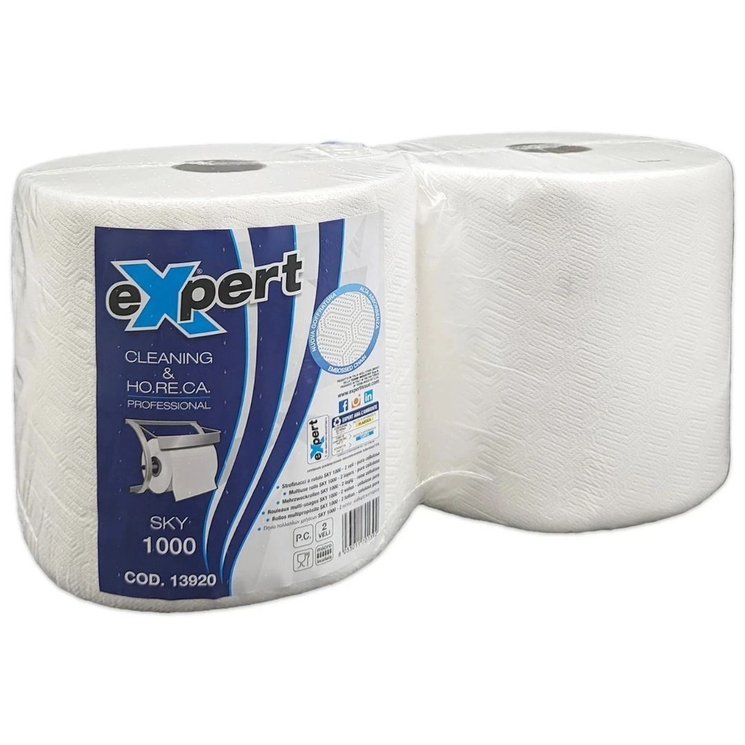 Il set Expert Sky include 2 rotoloni professionali da 500 strappi ciascuno, pensati per rispondere alle esigenze del settore Horeca e di tutte le attività che necessitano di alta resistenza e capacità assorbente.