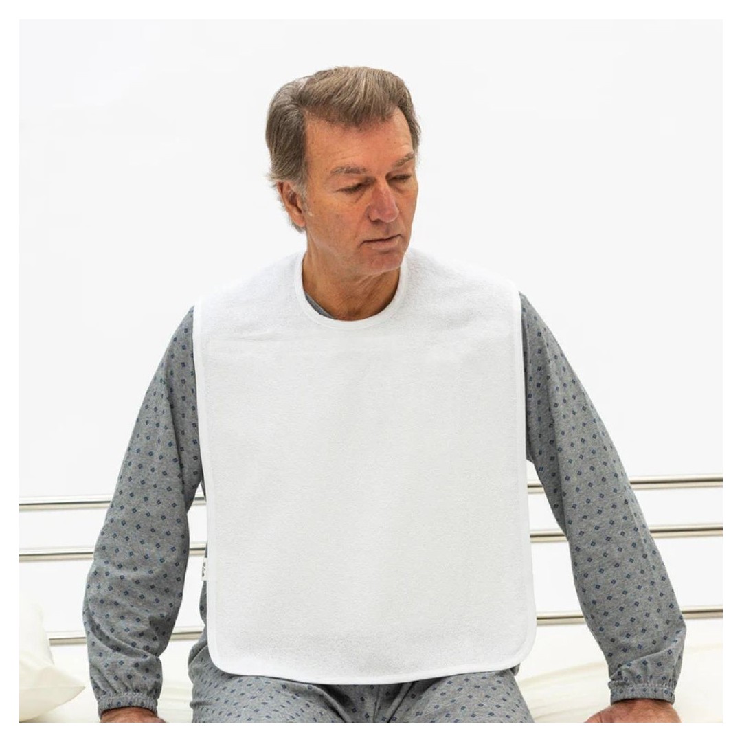 Realizzato in 100% cotone con tessuto in spugna morbida e assorbente, protegge efficacemente vestiti e bavaglini da macchie e residui di cibo, offrendo comfort e resistenza.